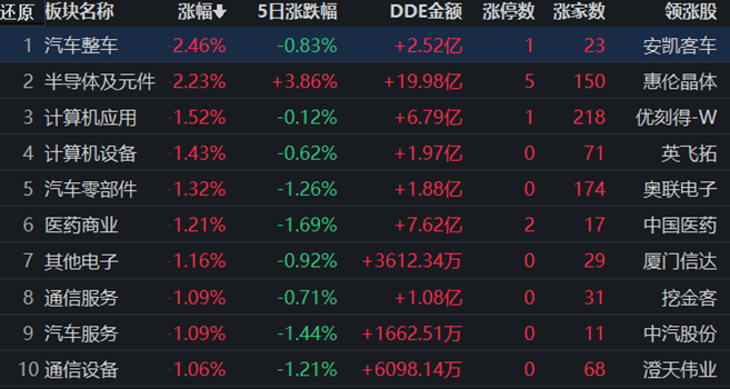 同花順行業(yè)方面,截至12月15日11:30,76類(lèi)行業(yè)中34類(lèi)上漲,占比44.74%,其中,汽車(chē)整車(chē)行業(yè)漲幅居首,達(dá)2.46%,此外,半導(dǎo)體及元件漲幅超2%。貴金屬跌幅居首,達(dá)2.61%。
