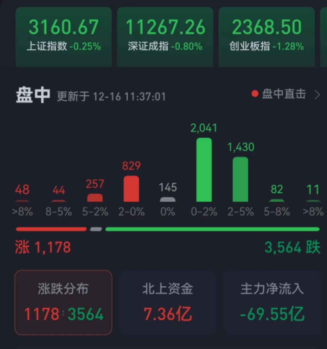 周五(12月16日),三大股指繼續(xù)震蕩回落。截至上午收盤,上證指數(shù)跌幅為0.25%,報3160.67點;深證成指跌幅為0.80%,創(chuàng)業(yè)板指跌幅為1.28%;滬深兩市合計成交額4680.8億元,總體來看,兩市個股跌多漲少,超3000只個股下跌,其中,漲停個股27只,跌停個股5只。