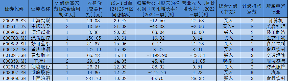 從市場表現(xiàn)來看,12月份(12月1日至12月26日),上述76只獲得調(diào)高評級的個股中有40只個股期間累計漲幅跑贏上證指數(shù)(期間累計跌幅2.72%),占比超五成,其中,上海鋼聯(lián)(39.47%)、中順潔柔(21.08%)、博匯紙業(yè)(20.05%)3只個股期間累計漲幅均超20%。