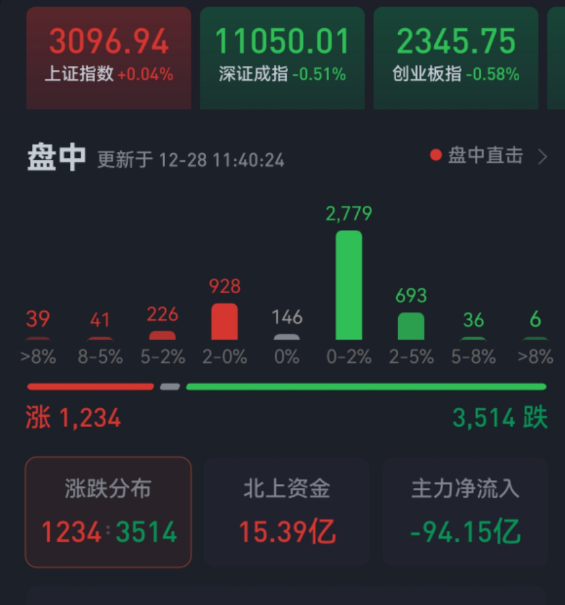 周三(12月28日),三大股指繼續(xù)震蕩分化。截至上午收盤,上證指數(shù)漲0.04%,報3096.94點(diǎn),逼近3100點(diǎn)關(guān)口;深證成指跌幅為0.51%,創(chuàng)業(yè)板指跌幅為0.58%;滬深兩市合計成交額4116.6億元,總體來看,兩市個股跌多漲少,其中,漲停個股達(dá)28只,跌停7只。