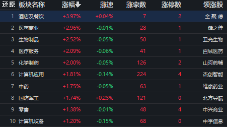 同花順行業(yè)方面,截至12月29日11:30,76類行業(yè)中39類上漲,占比51.32%,其中,酒店及餐飲行業(yè)漲幅居首,達3.97%,此外,醫(yī)藥商業(yè)、生物制品、醫(yī)療服務(wù)、化學制藥等4類醫(yī)藥相關(guān)板塊漲幅也均超2%。下跌方面,房地產(chǎn)服務(wù)跌幅居首,達2.17%。