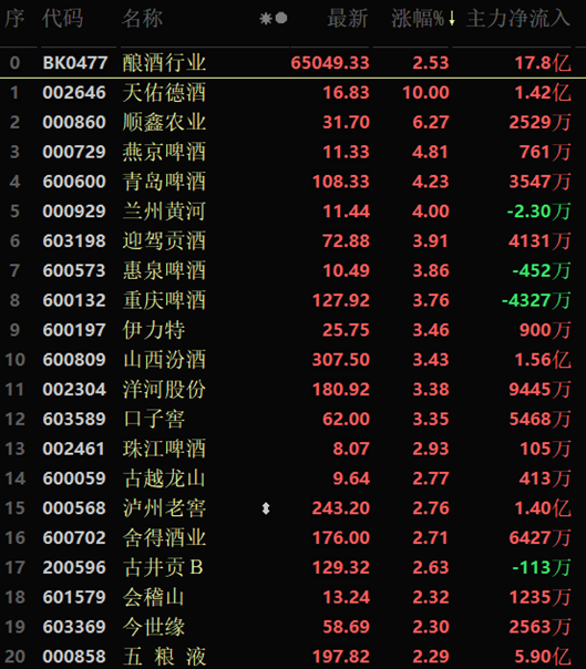 從早盤表現(xiàn)強勢的釀酒行業(yè)看,交易中的40只成份股全線上漲,其中有1只封漲停板。資金流向看,釀酒行業(yè)大單資金凈流入額為17.8億元,居行業(yè)第1位。