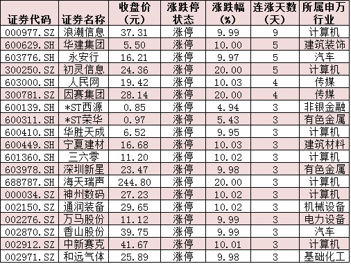 表:連續(xù)上漲3日且今日收盤漲停個股情況: