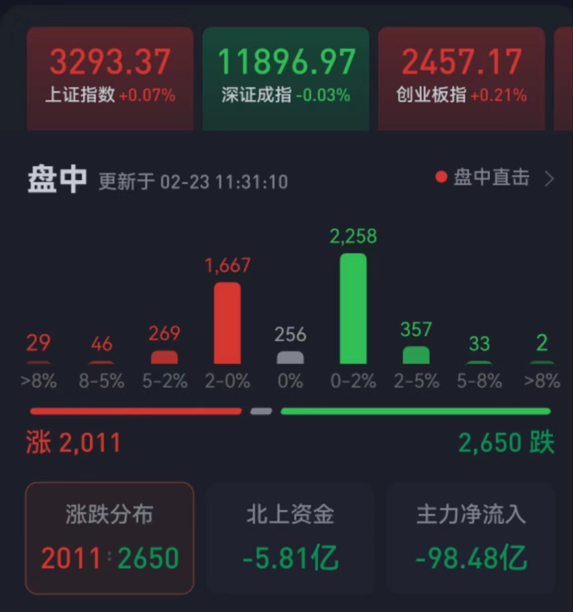 周四(2月23日),三大股指繼續(xù)震蕩分化,漲跌不一。截至上午收盤,上證指數(shù)漲幅達(dá)0.07%,報(bào)3293.37點(diǎn);深證成指跌幅為0.03%,創(chuàng)業(yè)板指漲幅達(dá)0.21%;滬深兩市合計(jì)成交額4881.3億元,總體來(lái)看,兩市個(gè)股跌多漲少。