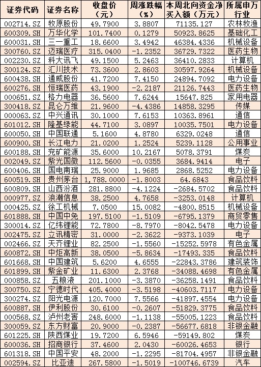 資金方面,本周,北向資金凈賣出金額達(dá)41.24億元,終結(jié)連續(xù)14周凈買入態(tài)勢(shì)。從前十大成交活躍股來看,本周,牧原股份、萬華化學(xué)等2只個(gè)股,北向資金凈買入金額均超5億元。另外,比亞迪、中國(guó)平安、招商銀行等個(gè)股遭北向資金凈賣出金額均超6億元。