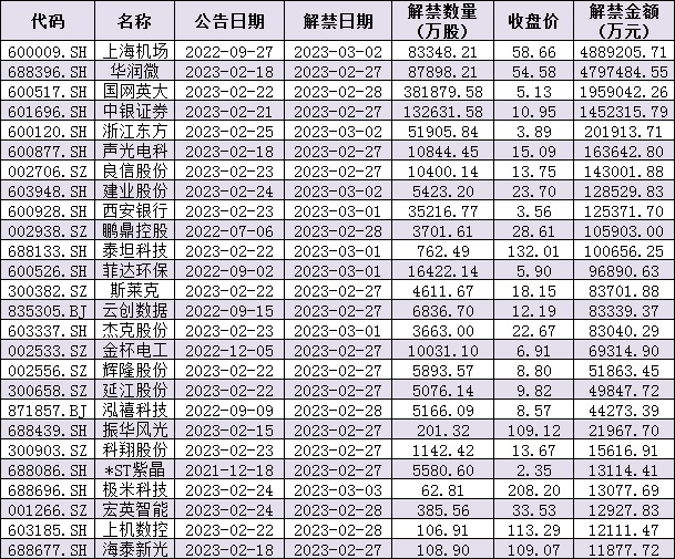 與此同時(shí),統(tǒng)計(jì)顯示,下周(2月27日-3月3日)共有71家公司限售股陸續(xù)解禁,按最新收盤價(jià)計(jì)算,解禁市值為1487.56億元。具體來看,解禁市值居前三位的是上海機(jī)場(chǎng)(488.9億元)、華潤(rùn)微(479.75億元)、國(guó)網(wǎng)英大(195.9億元)。