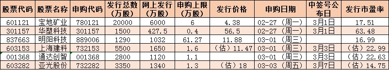 根據(jù)發(fā)行安排,下周(2月27日-3月3日)共有6只新股發(fā)行,其中科創(chuàng)業(yè)板1只(華塑科技)、滬市3只(寶地礦業(yè)、上海建科、亞光股份)、深市1只(通達(dá)創(chuàng)智)、北交所1只(明陽科技)。