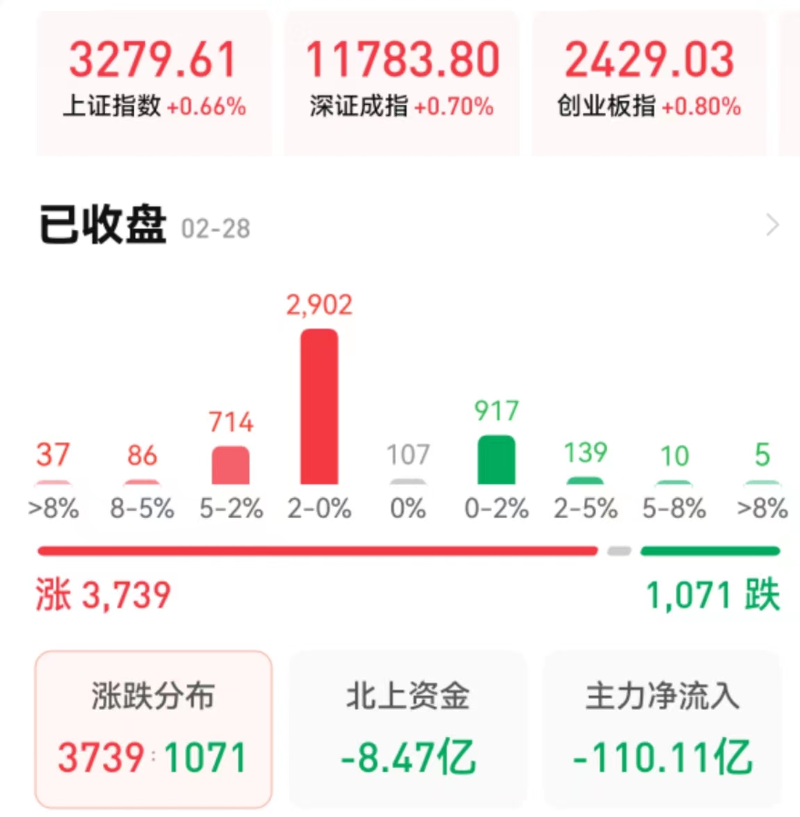 周二(2月28日),A股三大指數(shù)震蕩上行,全線飄紅。截至收盤,上證指數(shù)漲0.66%報(bào)3279.61點(diǎn),深證成指漲0.70%報(bào)11783.8點(diǎn),創(chuàng)業(yè)板指漲0.80%報(bào)2429.03點(diǎn);兩市合計(jì)成交金額達(dá)7567億元,北向資金凈賣出13.04億元??傮w上看,兩市個(gè)股漲多跌少。其中,漲停個(gè)股達(dá)33只,跌停個(gè)股2只。