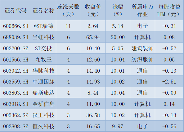 表:連續(xù)上漲3日且今日收盤漲停股一覽