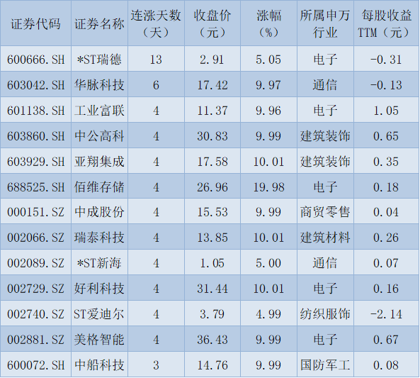 表:連續(xù)上漲3日且今日收盤(pán)漲停股一覽