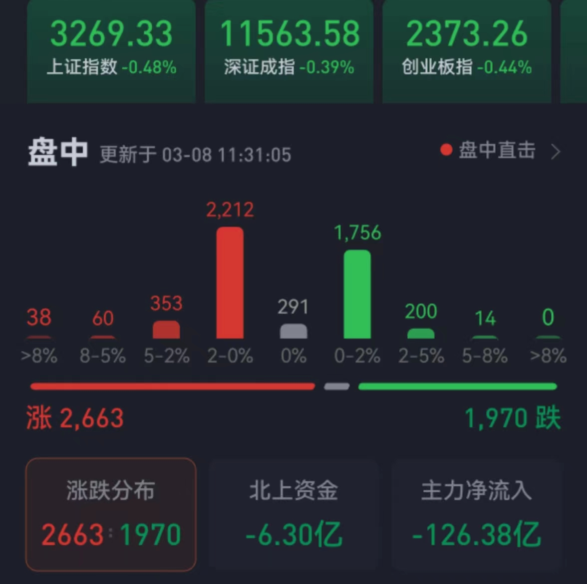 周三(3月8日),三大股指繼續(xù)震蕩整理,略有回落。截至上午收盤,上證指數(shù)跌幅達0.48%,報3269.33點;深證成指和創(chuàng)業(yè)板指跌幅分別為0.39%和0.44%;滬深兩市合計成交額4447.2億元,總體來看,兩市個股漲多跌少。