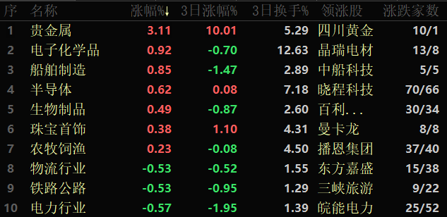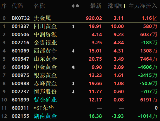 從早盤表現(xiàn)相對(duì)強(qiáng)勢(shì)的貴金屬行業(yè)看,該行業(yè)近3個(gè)交易日連續(xù)上漲,截至今日11:30累計(jì)漲幅達(dá)10.01%,早盤交易中的11只成份股中有10只上漲,其中,有2只個(gè)股漲幅超5%。資金方面,有1.16億元大單資金凈流入該板塊,居各行業(yè)板塊第3位。