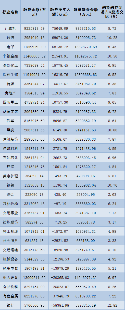 表:3月13日申萬一級(jí)行業(yè)兩融交易情況: