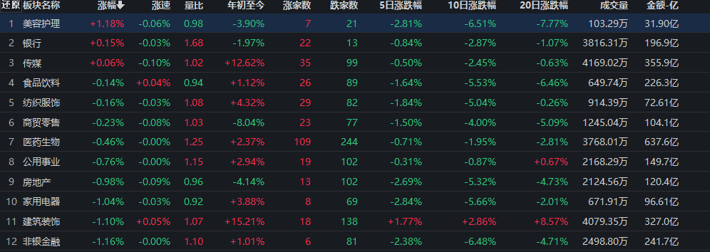 市場震蕩過程中,熱點快速輪動。從31類申萬一級行業(yè)看,僅3類行業(yè)上漲,其余行業(yè)均出現(xiàn)下跌。上漲方面,昨日下跌達1.45%的美容護理行業(yè)今日領漲,漲幅達1.18%,另外,銀行和傳媒等兩行業(yè)上漲,漲幅分別為0.15%、0.06%。下跌方面,煤炭居首,跌幅達3.29%,有色金屬、電力設備、石油石化也均跌超3%,分別為3.16%、3.13、3.09%。