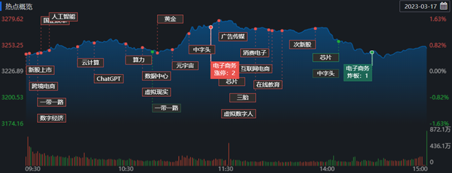 3月17日,滬深兩市三大指數(shù)震蕩分化,滬指日K線走出長(zhǎng)上影的仙人指路形態(tài),深證成指則連續(xù)兩天收盤(pán)處于半年線之下。截至收盤(pán),上證指數(shù)漲0.73%報(bào)3250.55點(diǎn);深證成指漲0.36%報(bào)11278.05點(diǎn),創(chuàng)業(yè)板指跌0.36%報(bào)2293.67點(diǎn),A股合計(jì)成交額9734.32億元,較前一交易日增長(zhǎng)15.14%,北向資金凈買(mǎi)入71.83億元,滬股通凈買(mǎi)入11.45億元,深股通凈買(mǎi)入60.37億元。總體上看,A股中漲多跌少,有3220只上漲,1696只下跌。