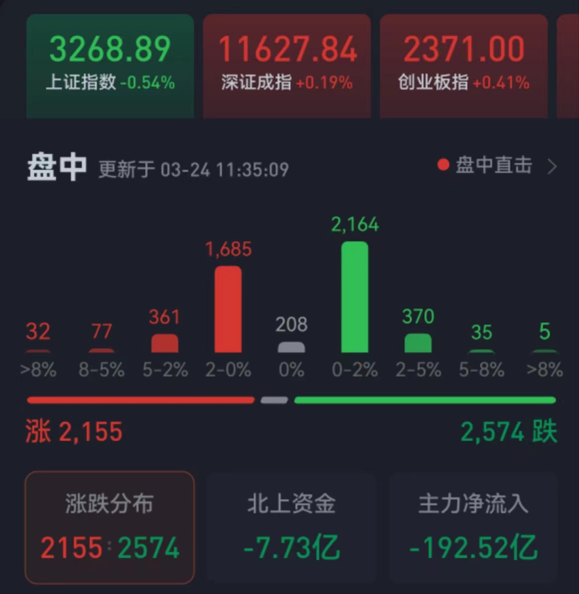 周五(3月24日),三大股指繼續(xù)震蕩分化,漲跌不一。截至上午收盤,上證指數(shù)跌幅達(dá)0.54%,報(bào)3268.89點(diǎn);深證成指和創(chuàng)業(yè)板指漲幅分別為0.19%和0.41%;滬深兩市合計(jì)成交額6707.3億元,總體來(lái)看,兩市個(gè)股跌多漲少。