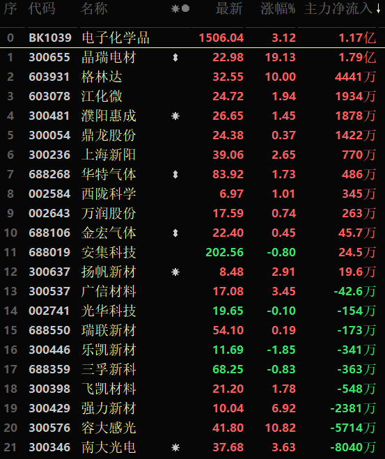 從早盤表現(xiàn)強(qiáng)勢(shì)的電子化學(xué)品行業(yè)看,該行業(yè)交易中的21只成份股中有17只上漲,其中,有4只個(gè)股漲幅超5%。資金方面,有1.17億元大單資金凈流入該行業(yè),居各行業(yè)資金凈流入排名第9位。