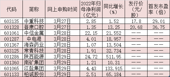 3月27日,首批滬深主板注冊(cè)制新股正式開(kāi)始網(wǎng)上申購(gòu)。首批10只滬深主板注冊(cè)制新股,中重科技、登康口腔在本周一(3月27日)申購(gòu);中電港、常青科技、中信金屬、海森藥業(yè)將在本周二(3月28日)申購(gòu);柏誠(chéng)股份、江鹽集團(tuán)、南礦集團(tuán)、陜西能源將在本周三(3月29日)申購(gòu)。