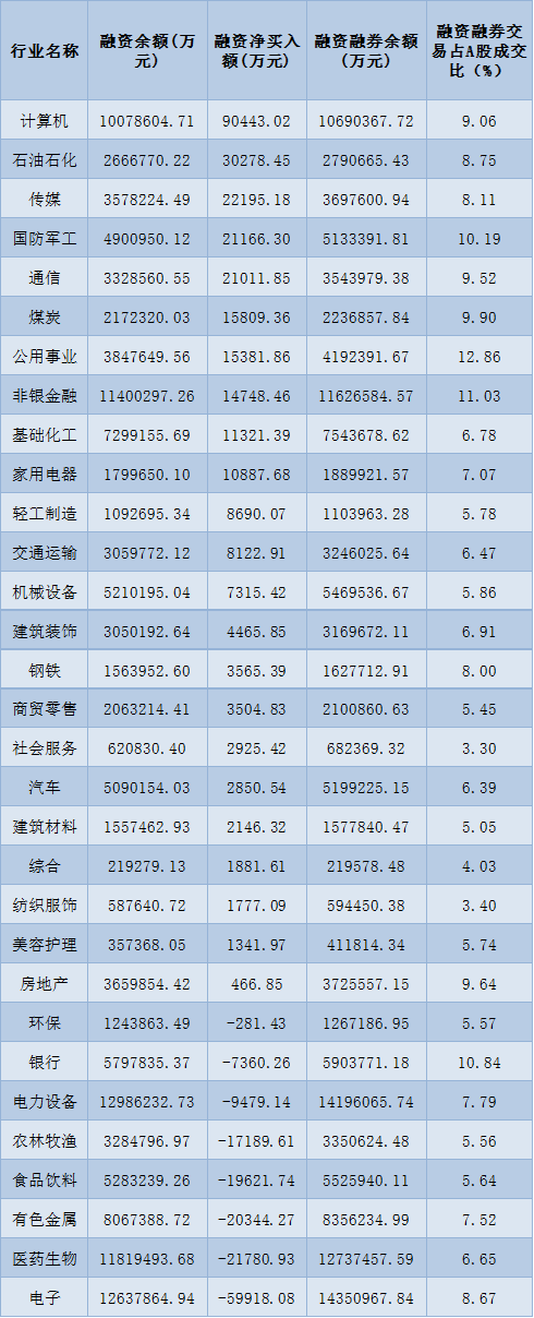 表:3月28日申萬一級(jí)行業(yè)兩融交易情況: