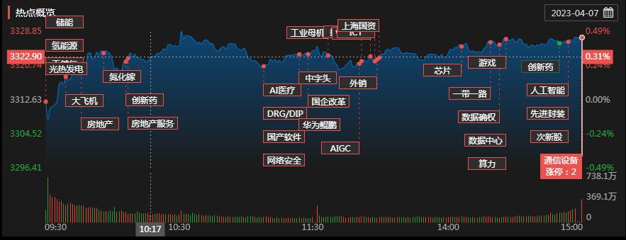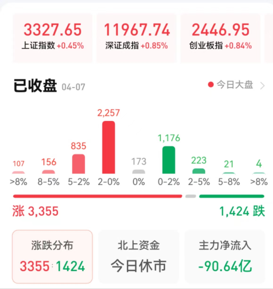周五(4月7日),A股三大股指震蕩上行,全線飄紅。截至收盤,上證指數(shù)漲0.45%報(bào)3327.65點(diǎn),實(shí)現(xiàn)六連陽;深證成指漲0.85%報(bào)11967.74點(diǎn),創(chuàng)業(yè)板指漲0.84%報(bào)2446.95點(diǎn),科創(chuàng)50指數(shù)漲1.23%;兩市合計(jì)成交金額達(dá)10540億元,連續(xù)第4個交易日突破萬億元;總體來看,A股個股漲多跌少。其中,漲停個股達(dá)49只,跌停個股達(dá)5只。