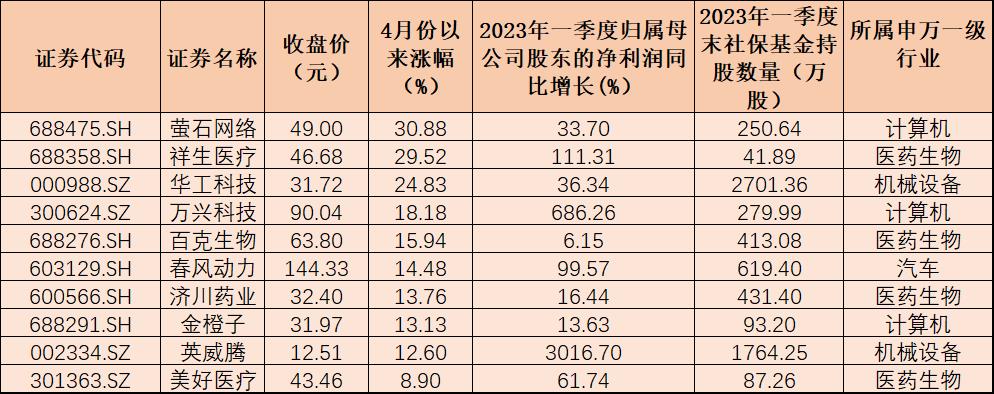 表:4月份以來(lái)社?;鹬貍}(cāng)股漲幅居前十個(gè)股一覽