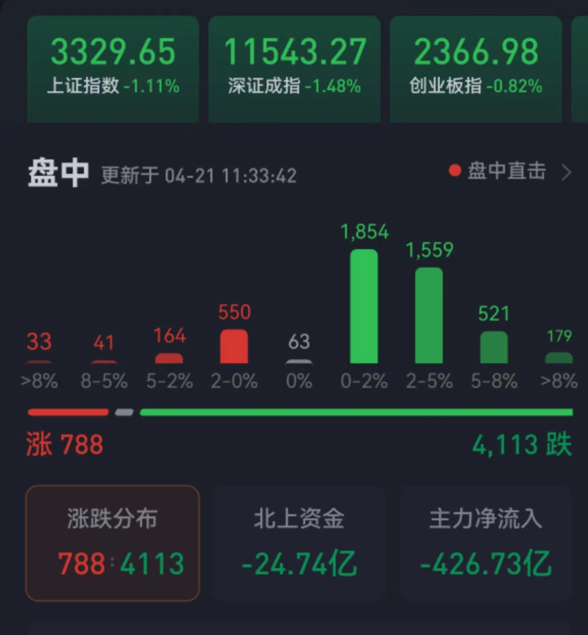 周五(4月21日),三大股指繼續(xù)震蕩整理。截至上午收盤,上證指數(shù)跌幅達1.11%,報3329.65點;深證成指和創(chuàng)業(yè)板指跌幅分別為1.48%和0.82%;滬深兩市合計成交額7897.2億元,總體來看,兩市個股跌多漲少,超4000只個股出現(xiàn)下跌。