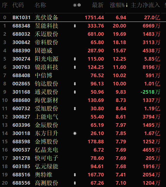 從早盤(pán)表現(xiàn)強(qiáng)勢(shì)的光伏設(shè)備行業(yè)看,交易中的48只成份股中有47只上漲,其中,有30只個(gè)股漲幅超5%。資金方面,有27億元大單資金凈流入該行業(yè),居各行業(yè)第1位。