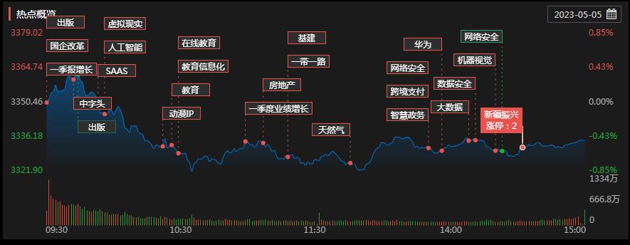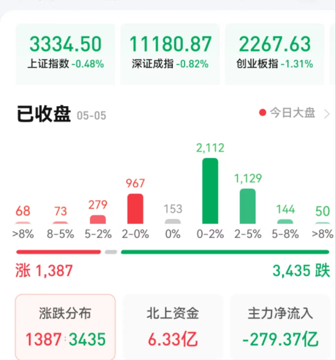 周五(5月5日),A股三大股指震蕩回落,全線下跌。截至收盤,上證指數(shù)跌0.48%報(bào)3334.5點(diǎn),深成指跌0.82%報(bào)11180.87點(diǎn),創(chuàng)業(yè)板指跌1.31%報(bào)2267.63點(diǎn),科創(chuàng)50指數(shù)跌1.42%;兩市合計(jì)成交10712億元,連續(xù)第21個(gè)交易日突破萬億元,北向資金凈買入6.33億元??傮w上看,兩市個(gè)股跌多漲少。其中,漲停個(gè)股達(dá)50只,跌停個(gè)股達(dá)50只。