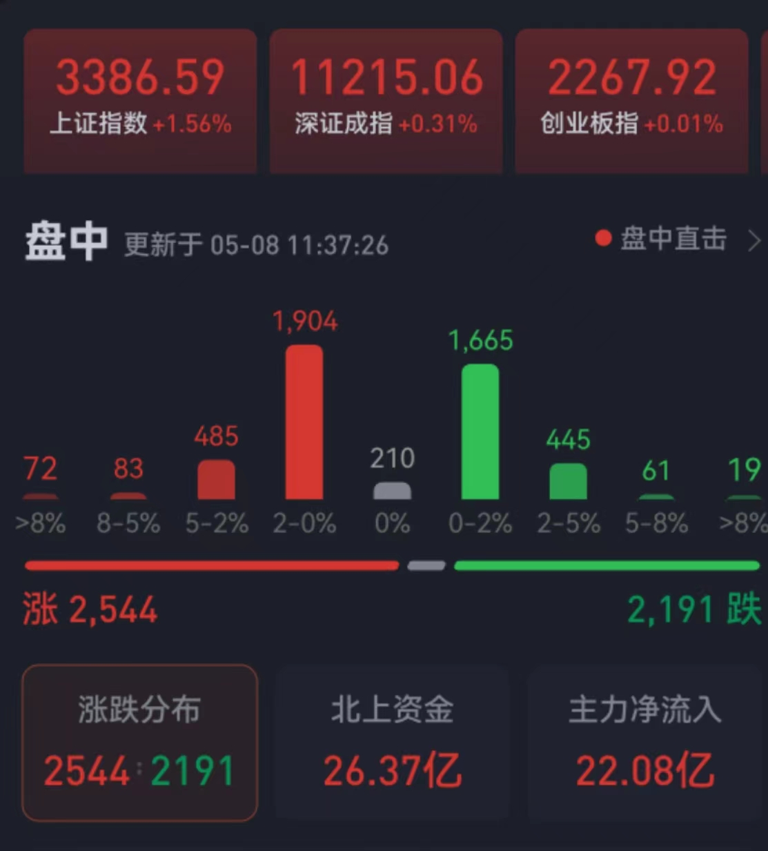 周一(5月8日),三大股指震蕩攀升,全線飄紅。截至上午收盤,上證指數(shù)漲幅達(dá)1.56%,報(bào)3386.59點(diǎn);深證成指和創(chuàng)業(yè)板指漲幅分別為0.31%和0.01%;滬深兩市合計(jì)成交額7383.6億元,總體來(lái)看,兩市個(gè)股漲多跌少。