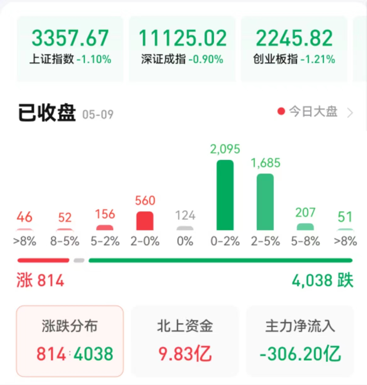 周二(5月9日),A股三大股指震蕩回落,全線下跌。截至收盤,上證指數(shù)跌1.1%報(bào)3357.67點(diǎn),深證成指跌0.90%報(bào)11125.02點(diǎn),創(chuàng)業(yè)板指跌1.21%報(bào)2245.82點(diǎn);兩市合計(jì)成交金額12218億元,連續(xù)第23個(gè)交易日突破萬(wàn)億元,北向資金凈買入9.83億元??傮w上看,兩市個(gè)股跌多漲少,超4000只個(gè)股下跌。其中,漲停個(gè)股達(dá)24只,跌停個(gè)股達(dá)72只。