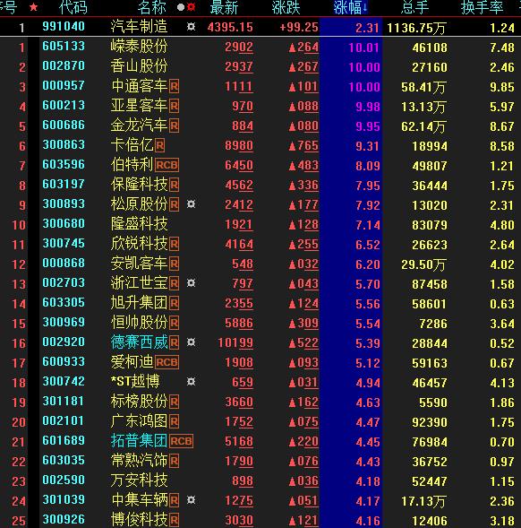 具體看,截至5月10日上午收盤,汽車制造板塊漲幅居首達(dá)2.31%。其中,嶸泰股份、香山股份、中通客車等多只概念股集體漲停。
