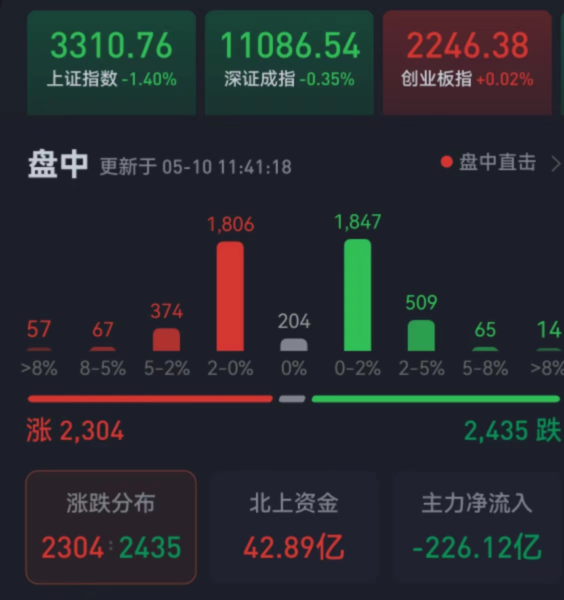 周三(5月10日),A股三大股指震蕩分化,漲跌不一。截至上午收盤,上證指數(shù)跌幅達(dá)1.40%,報3310.76點;深證成指跌幅達(dá)0.35%,創(chuàng)業(yè)板指漲幅為0.02%;滬深兩市合計成交額6453.2億元,總體來看,兩市個股跌多漲少。
