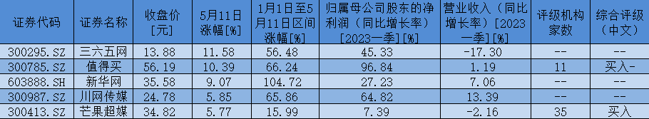表:5月11日,數(shù)字媒體板塊漲幅超5%個股以來