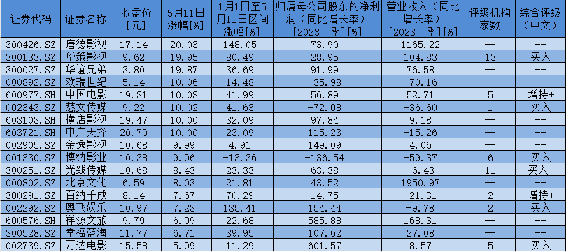 表:5月11日,影視院線板塊漲幅超5%個股以來