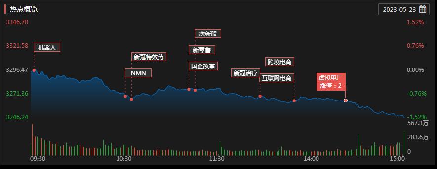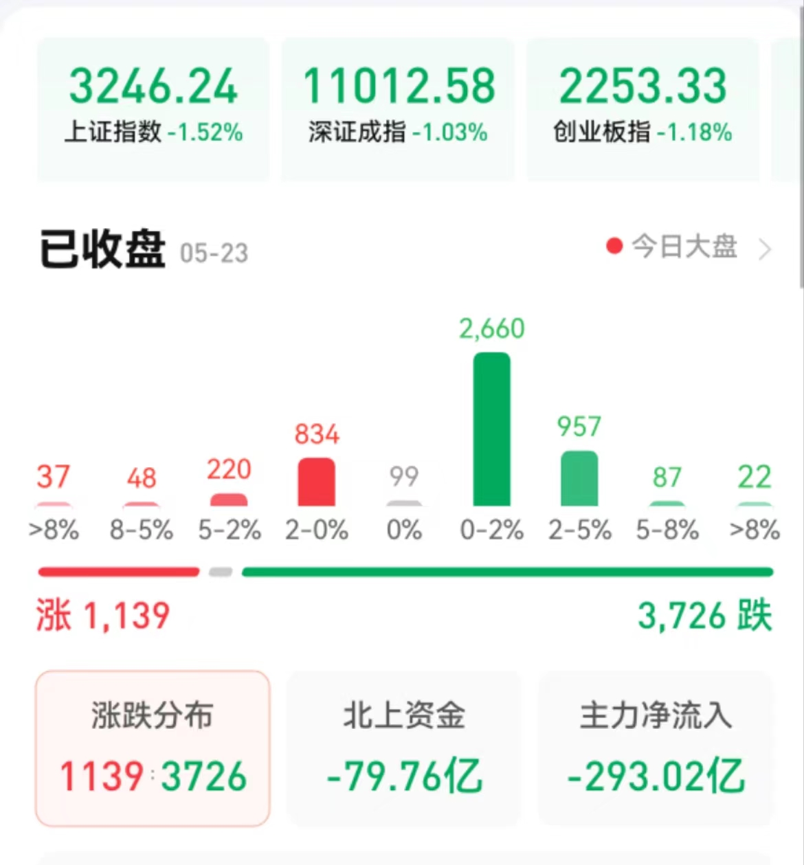 周二(5月23日),A股三大股指震蕩回落,跌幅均超1%。截至收盤,上證指數(shù)跌1.52%,收報(bào)3246.24點(diǎn);深證成指跌1.03%,收報(bào)11012.58點(diǎn);創(chuàng)業(yè)板指跌1.18%,收報(bào)2253.33點(diǎn)。市場成交額持續(xù)低迷,合計(jì)金額僅7658億元,北向資金凈賣出79.76億元,創(chuàng)近7個(gè)月最大凈賣出額??傮w上看,A股個(gè)股跌多漲少,上漲個(gè)股為1139只,下跌個(gè)股3726只。其中,漲停個(gè)股達(dá)44只,跌停個(gè)股達(dá)12只。