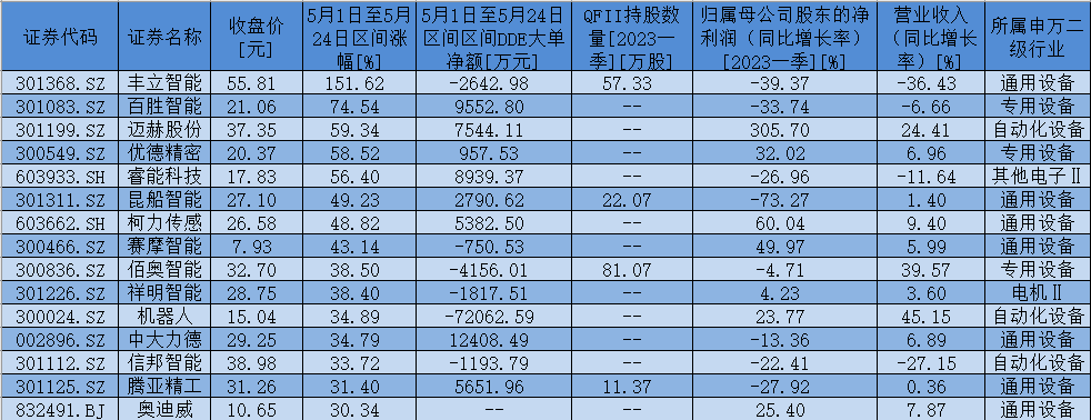 表:5月1日至5月24日,機器人概念板塊區(qū)間漲幅超30%個股一覽