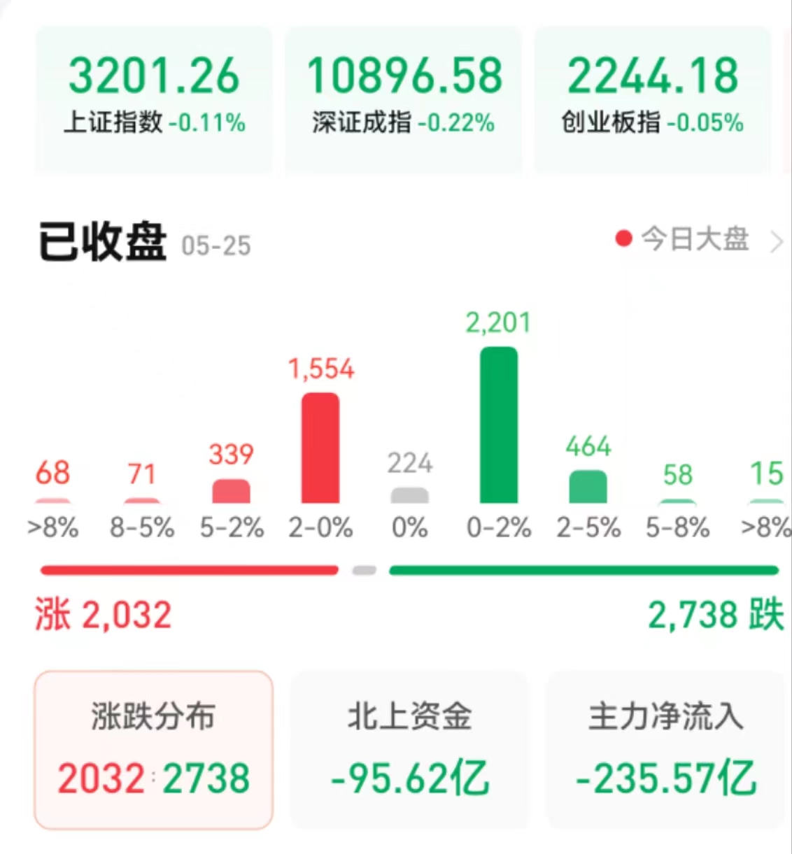 周四(5月25日),A股三大股指震蕩整理。截至收盤,上證指數(shù)跌0.11%報3201.26點,深證成指跌0.22%報10896.59點,創(chuàng)業(yè)板指微跌0.05%報2244.18點;兩市合計成交8569億元,北向資金凈賣出95.62億元??傮w上看,兩市個股跌多漲少。其中,漲停個股達(dá)49只,跌停個股達(dá)36只。