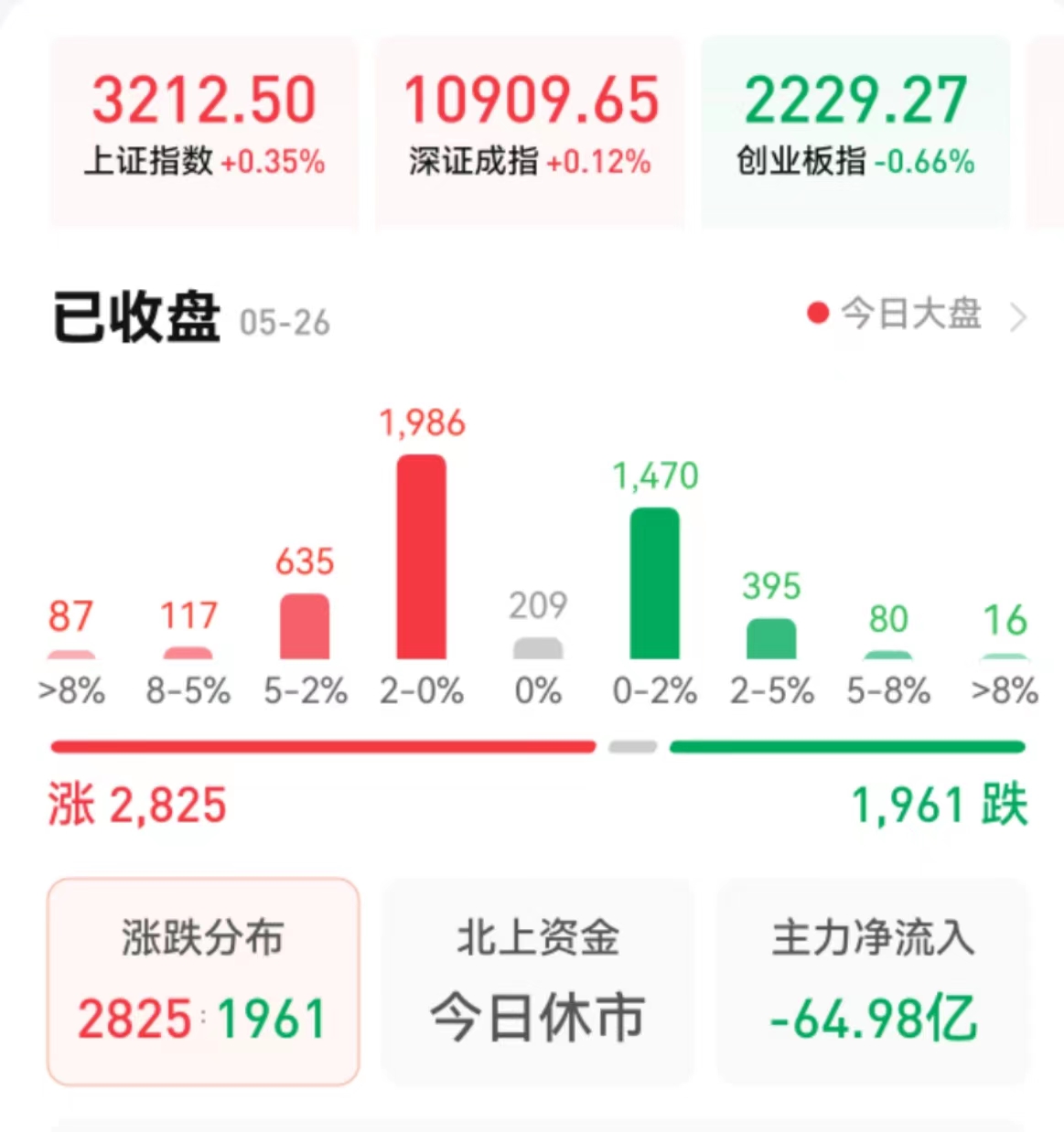 周五(5月26日),A股三大股指震蕩分化,漲跌不一。截至收盤,上證指數漲0.35%報3212.50點,深證成指漲0.12%報10909.65點,創(chuàng)業(yè)板指微跌0.66%報2229.27點;兩市合計成交8205億元??傮w上看,兩市個股漲多跌少。其中,漲停個股達52只,跌停個股達25只。
