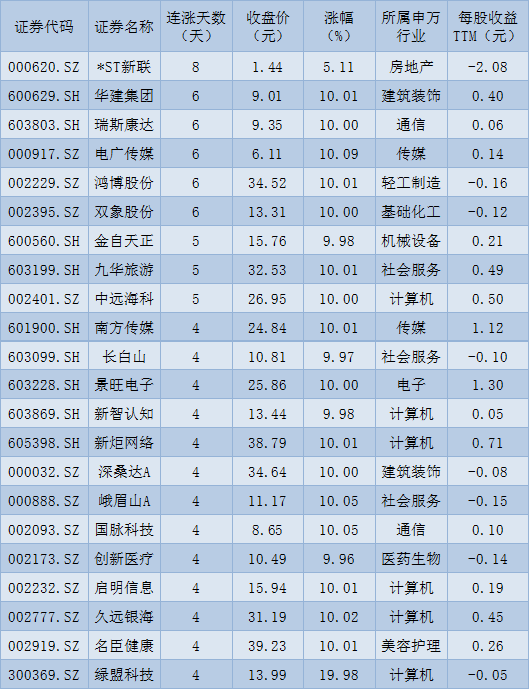 表:連續(xù)上漲4日且今日收盤(pán)漲停股一覽
