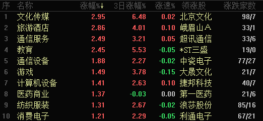東方財(cái)富行業(yè)方面,截至6月5日11:30,86個(gè)行業(yè)板塊中43個(gè)上漲,占比50%,其中,文化傳媒行業(yè)漲幅居前,達(dá)2.95%,此外,旅游酒店、通信服務(wù)、教育和通信設(shè)備等3個(gè)行業(yè)漲幅均超2%。下跌方面,貴金屬行業(yè)居首,跌幅達(dá)2.20%。