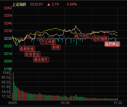 6月5日早盤,A股三大指數(shù)震蕩分化,滬市表現(xiàn)相對(duì)強(qiáng)勢(shì),長(zhǎng)時(shí)間處于紅盤。截至上午11:30,上證指數(shù)漲0.08%,報(bào)3232.81點(diǎn),深證成指和創(chuàng)業(yè)板指跌幅分別為0.62%和1.47%;滬深兩市成交額合計(jì)5702億元??傮w來看,A股市場(chǎng)個(gè)股漲跌數(shù)接近,有2449只上漲,2469只下跌,漲跌停方面,有50只個(gè)股漲停,跌停股10只。