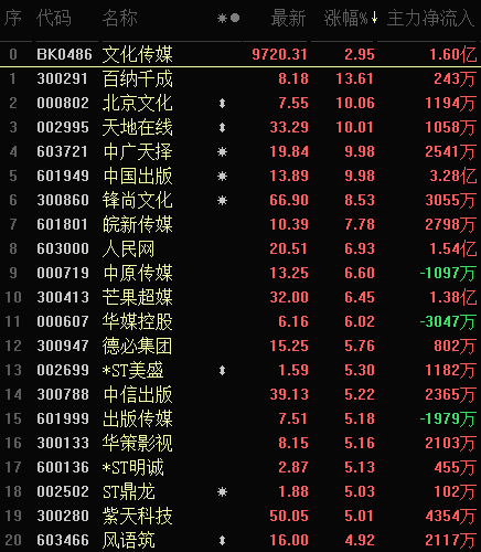 從早盤表現(xiàn)強(qiáng)勢(shì)的文化傳媒行業(yè)看,交易中的107只成份股中有98只上漲,其中,有19只個(gè)股漲幅超5%。資金方面,有1.60億元大單資金凈流入該行業(yè),居各行業(yè)第5位。