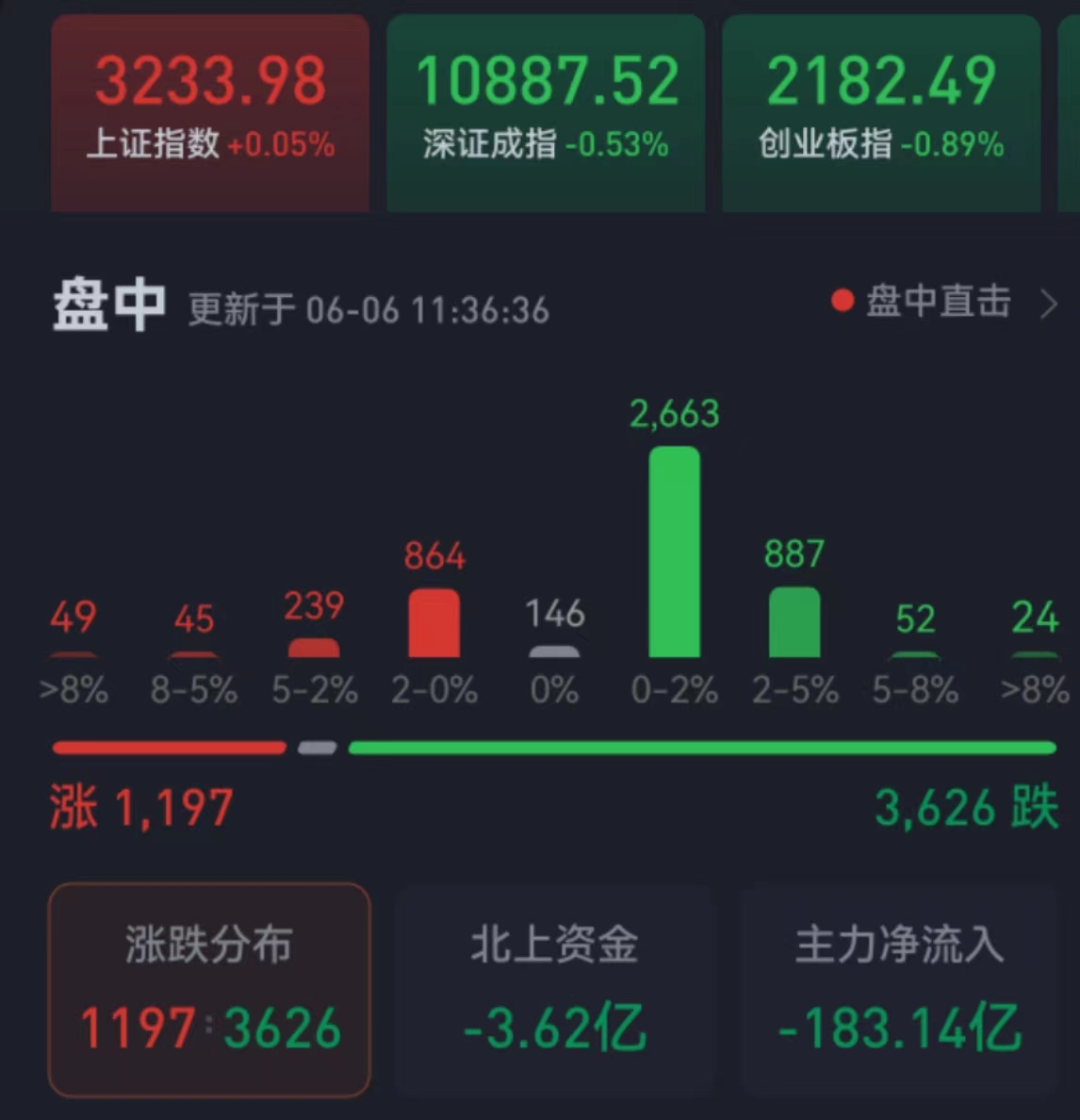 周二(6月6日),三大股指繼續(xù)震蕩整理。截至上午收盤(pán),上證指數(shù)漲0.05%,報(bào)3233.98點(diǎn);深證成指和創(chuàng)業(yè)板指分別跌0.53%和0.89%;滬深兩市合計(jì)成交額5505.6億元,總體來(lái)看,兩市個(gè)股跌多漲少。