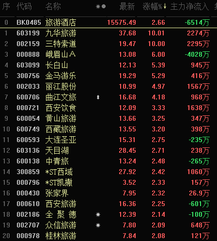 從早盤表現(xiàn)強(qiáng)勢(shì)的旅游酒店行業(yè)看,交易中的34只成份股中有31只上漲,其中,有5只個(gè)股漲幅超5%。資金方面,有6514萬(wàn)元大單資金凈流出該行業(yè)。