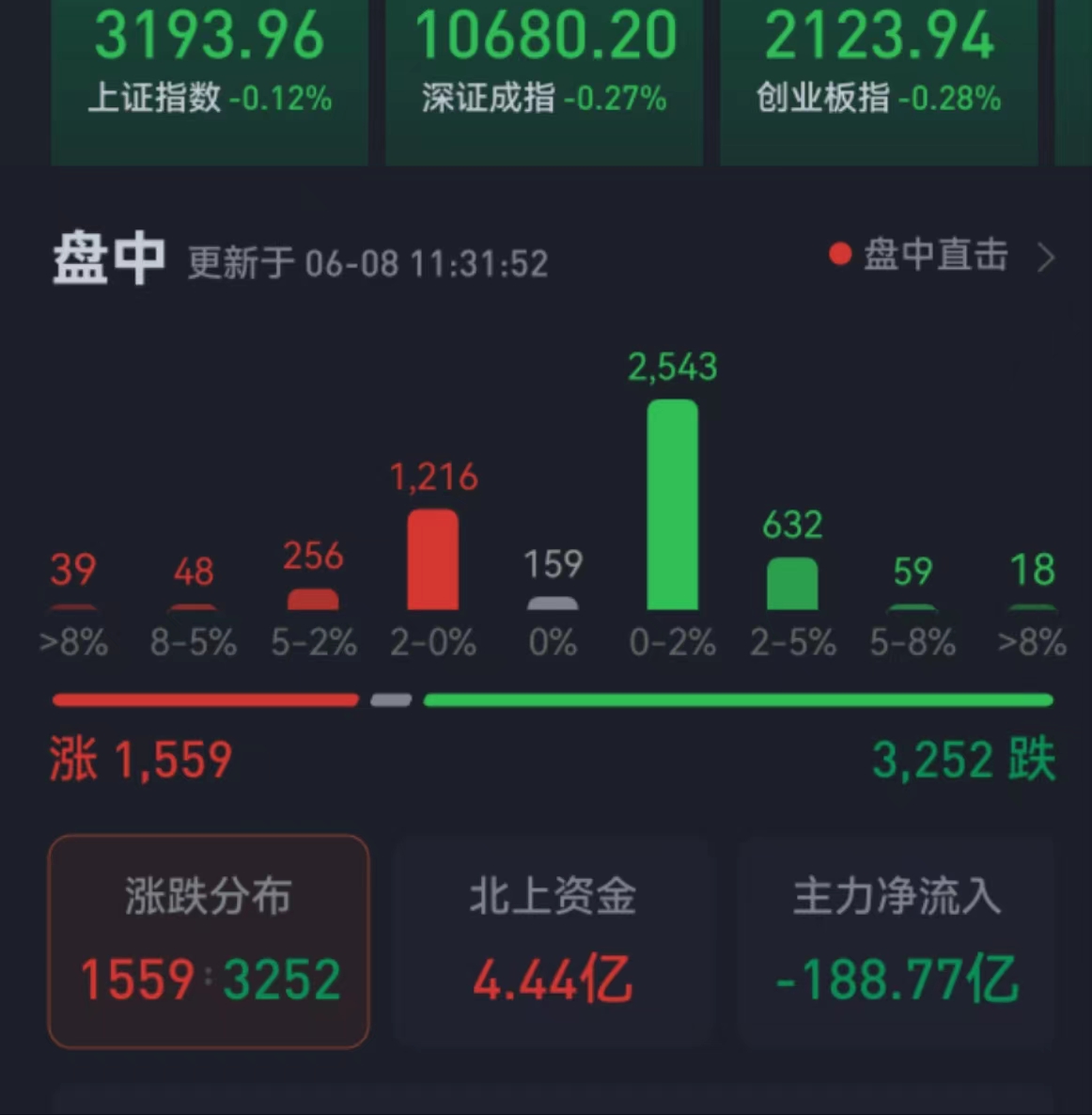 周四(6月8日),三大股指繼續(xù)震蕩整理。截至上午收盤,上證指數(shù)跌0.12%,報(bào)3193.96點(diǎn);深證成指和創(chuàng)業(yè)板指分別下跌0.27%和0.28%;滬深兩市合計(jì)成交額5372.7億元,總體來(lái)看,兩市個(gè)股跌多漲少。