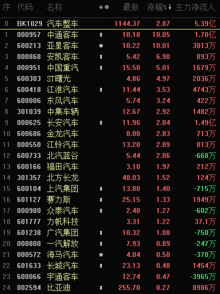 從早盤表現(xiàn)強勢的汽車整車行業(yè)看,交易中的24只成份股全線上漲,其中,有4只個股漲幅超5%。資金方面,有5.39億元大單資金凈流入該行業(yè),居第3位。