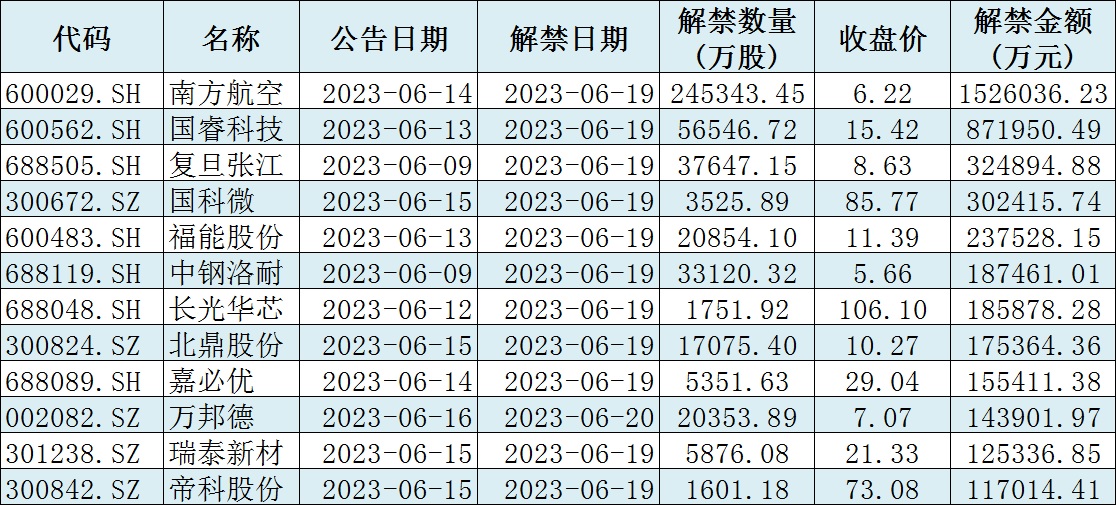 與此同時(shí),據(jù)同花順統(tǒng)計(jì)顯示,下周(6月19日-23日)共有64家公司限售股陸續(xù)解禁,按最新收盤價(jià)計(jì)算,解禁市值為510.1億元。從解禁市值來看,南方航空(152.6億元)、國??萍迹?7.2億元)等公司解禁金額均超80億元。