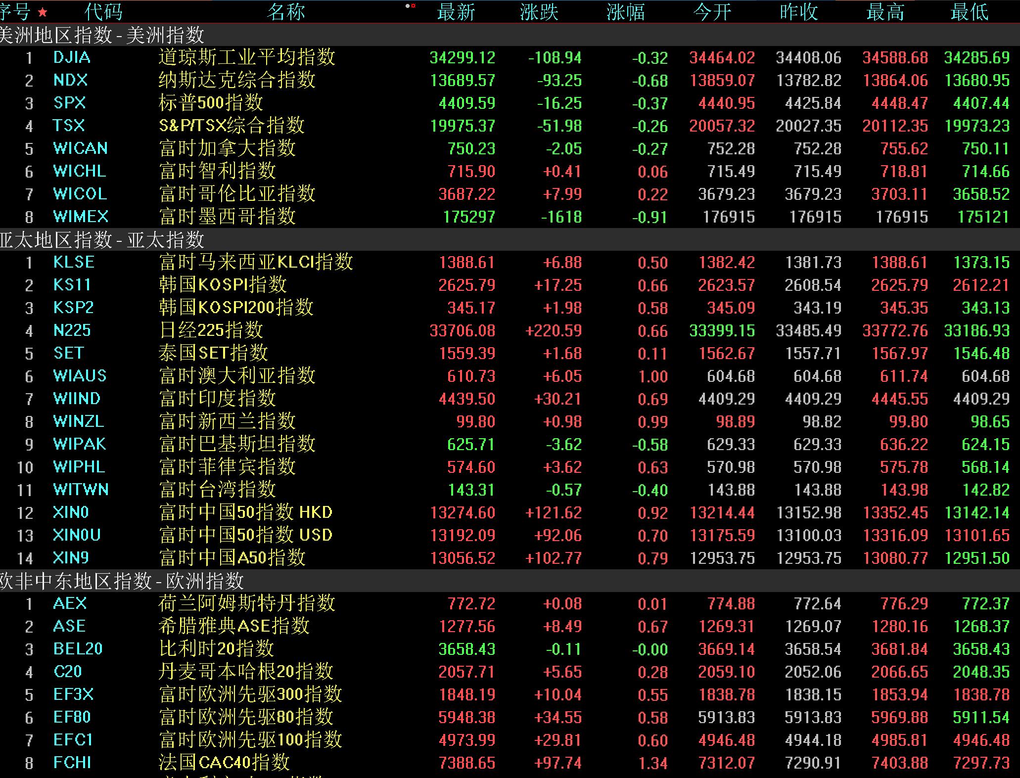 周五,美國三大股指全線收跌,道指跌0.32%報(bào)34299.12點(diǎn),標(biāo)普500指數(shù)跌0.37%報(bào)4409.59點(diǎn),納指跌0.68%報(bào)13689.57點(diǎn)。本周,道指漲1.25%,標(biāo)普500指數(shù)漲2.58%,納指漲3.25%。