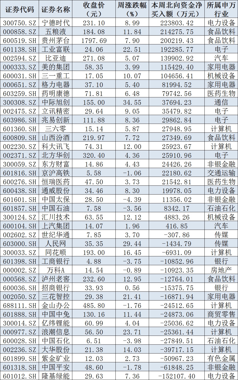 資金方面,本周,北向資金合計(jì)凈買入金額達(dá)143.91億元,創(chuàng)3個(gè)月來新高。6月16日,北向資金凈買入金額達(dá)105.46億元,為近4個(gè)月來最高。從前十大成交活躍股來看,寧德時(shí)代、五糧液、貴州茅臺等3只個(gè)股,北向資金凈買入金額均超20億元。另外,隆基綠能、中國平安、紫金礦業(yè)等個(gè)股遭北向資金凈賣出金額均超5億元。