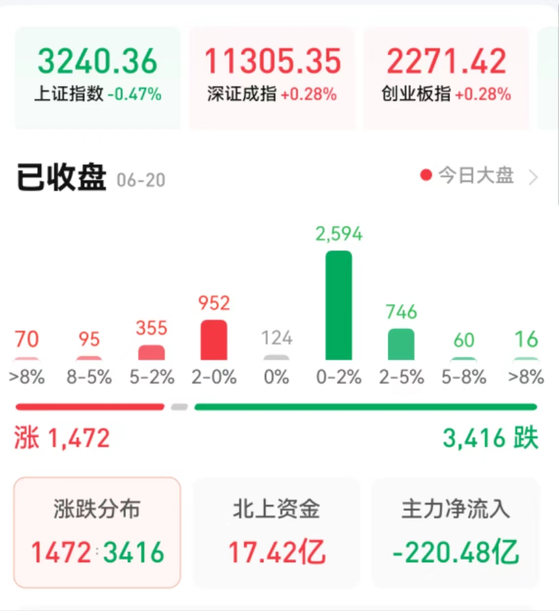 周二(6月20日),A股三大股指震蕩分化,漲跌不一。截至收盤,上證指數(shù)跌0.47%報(bào)3240.36點(diǎn),深證成指漲0.28%,報(bào)11305.35點(diǎn);創(chuàng)業(yè)板指漲0.28%,報(bào)2271.42點(diǎn);兩市合計(jì)成交10900億元,連續(xù)第5個(gè)交易日突破萬億元;北向資金凈買入17.42億元;總體來看,A股個(gè)股跌多漲少。其中,漲停個(gè)股達(dá)42只,跌停個(gè)股達(dá)11只。